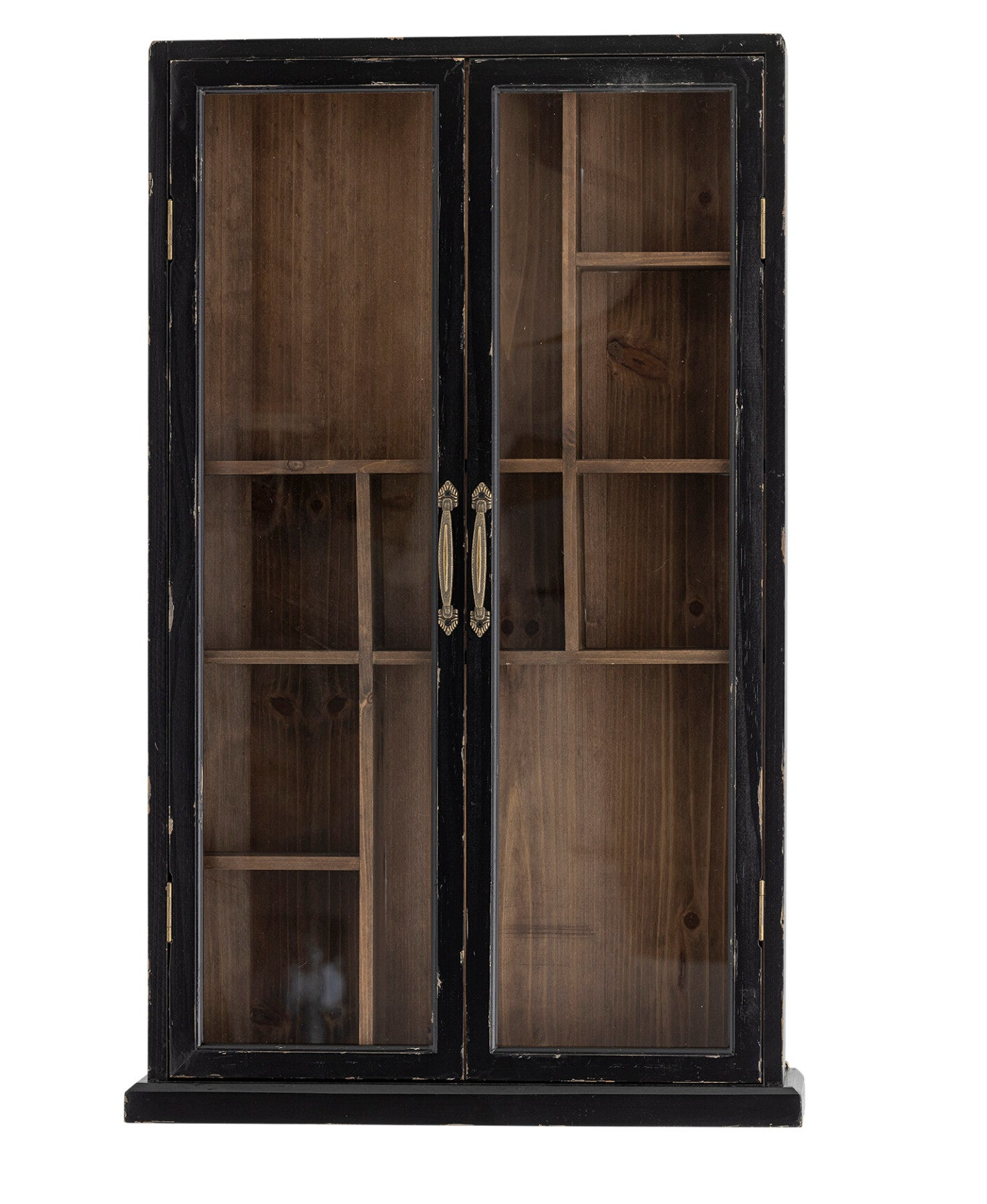 Dekorative Wandvitrine im schwarzen Shabby-Look im charmanten Landhausstil. Gefertigt aus Tannenholz, MDF, Eisen und gehärtetem Glas, verbindet sie rustikale Optik mit stabiler Verarbeitung. Die Glastüren mit antikmessingfarbenen Eisen-griffen setzen Geschirr, Gläser oder Dekoration stilvoll in Szene. Ideal für Küche, Esszimmer oder Wohnbereich im Industrial- oder Vintage-Ambiente.